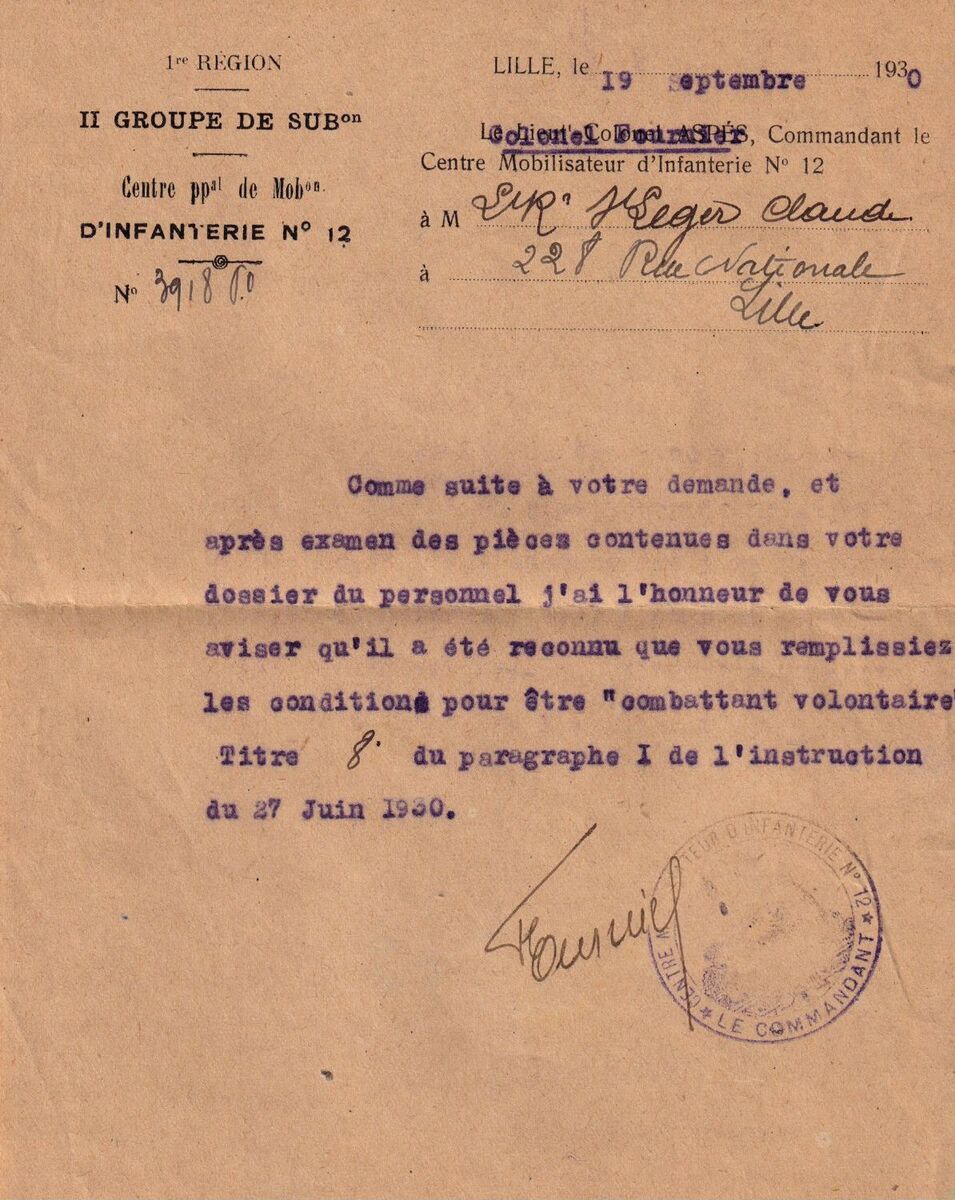 - 03 décembre 1939 : Mobilisation volontaire, affecté à la défense anti-aérienne de Lille. 3° Compagnie de Mitrailleurs de DAT - 5° section