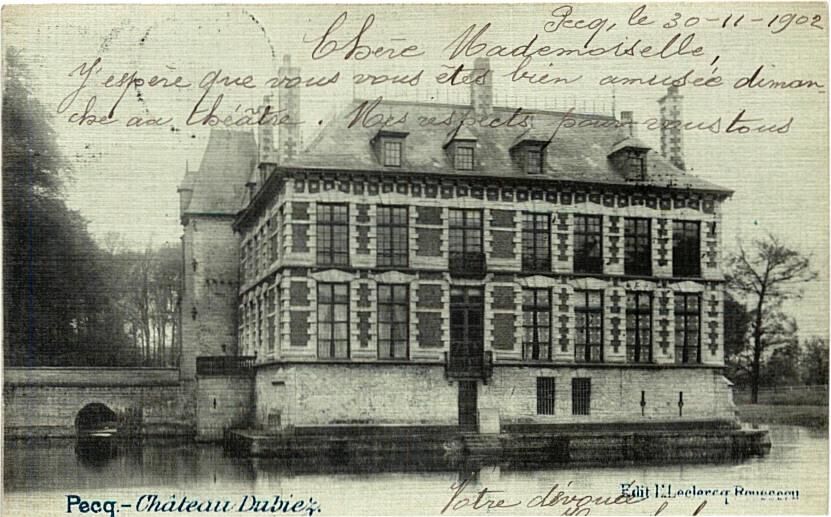 - Le Château de Pecq fut occupé par les allemands pendant la guerre 1914–1918, et transformé en caserne. Tous les arbres de l'avenue furent coupés. Un obus tomba dans la cour ébranlant sérieusement les toitures. (Agnès Wattinne)